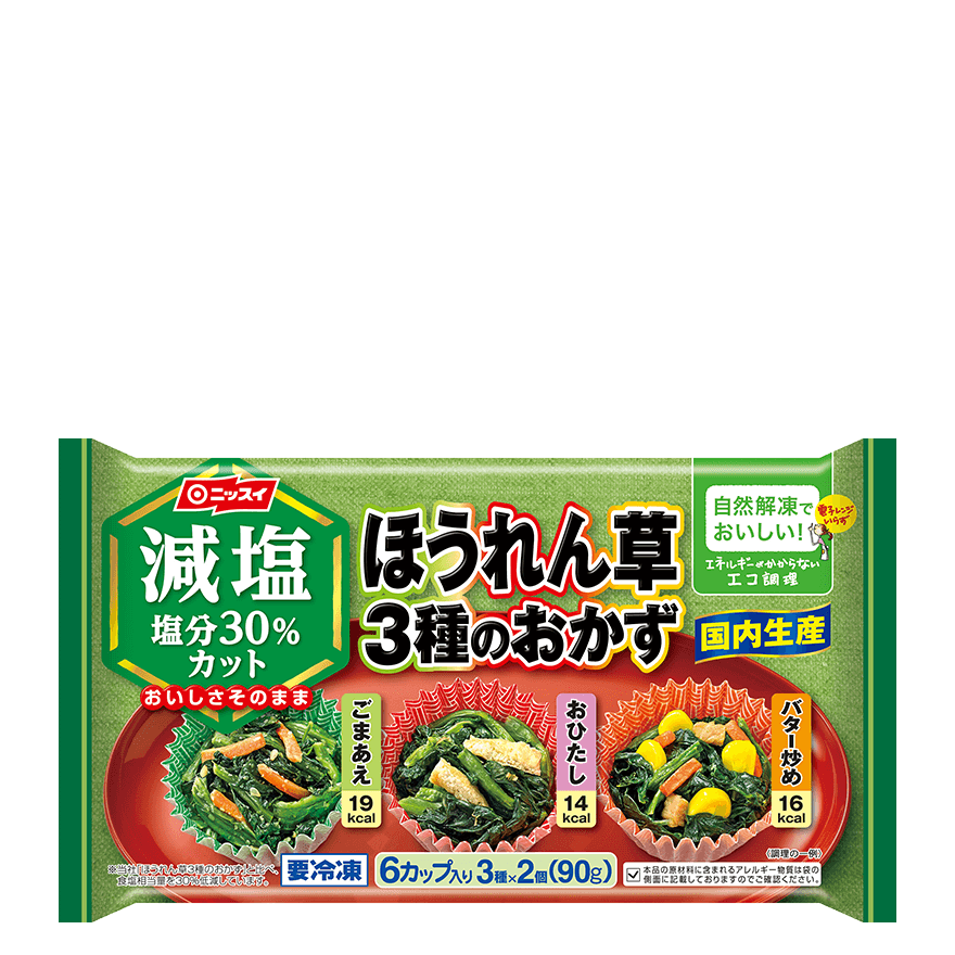 自然解凍でおいしい 減塩ほうれん草3種のおかず 商品情報 ニッスイ