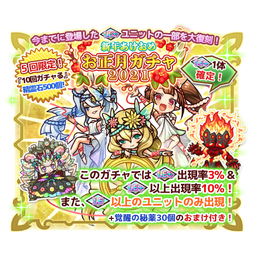 リ モンスター アプリ公式 期間限定ガチャ 新年あけおめお正月ガチャ21 今までに登場した一部の Le ユニットさんが大復刻してるよ 精霊石500個で 10回ガチャる ができて Le ユニットさんと Le 以上のユニットさんの排出率が